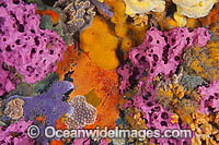Mix of colourful Sea Sponges and Bryozoans, encrusting a pylon at Edithburgh Jetty. Photo taken at York Peninsula, South Australia, Australia.