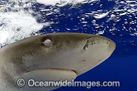 Oceanic Whitetip Shark (Carcharhinus longimanus), showing eyelid closed to protect the eye. This pelagic shark is an aggressive species and is found worldwide in tropical and temperate seas.
