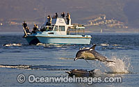 Short-beaked Common Dolphin (Delphinus delphis) with tourist boat. Found in warm-temperate and tropical seas throughout the world. Photo taken at Cape Town, South Africa