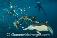 Divers observe a pod of Long-beaked Common Dolphins (Delphinus capensis), attacking a baitball of sardines, off Port Saint Johns on the Wild Coast of South Africa during the annual sardine run.