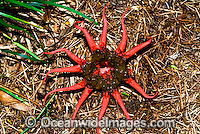 Red Fingers Fungi (Colus pusillus). Long red arms up to 65mm long. Inside of arms are coated with a foul smelling slimy spore mass that attracts flies and other insects. Coffs Harbour, New South Wales, Australia