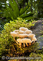 Australian Rainforest Fungi (Mycena sp.) on tree moss. Lamington National Park, Queensland, Australia