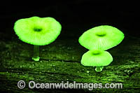 Bioluminescent Fungi (Mycena chlorophos). Photographed at night in Bruxner Nature Reserve Rainforest, Coffs Harbour, New South Wales, Australia.