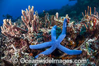 Blue Linckia Sea Star (Linckia laevigata) amongst fire Coral. Also known as Linckia Starfish. Great Barrier Reef, Queensland, Australia.