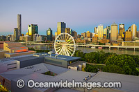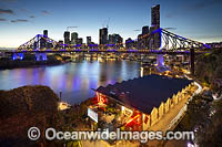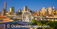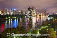Brisbane City during evening twilight hour, viewed from South Bank, a popular tourist recreational area on the Brisbane River. Brisbane, Queensland, Australia.