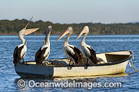 Australian Pelicans (Pelecanus conspicillatus), resting on a boat. This large water bird is found throughout Australia and New Guinea. Also in Fiji and parts of Indonesia and New Zealand. Central New South Wales coast, Australia.