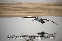 Australian Pelican (Pelecanus conspicillatus), in flight. This large water bird is found throughout Australia and New Guinea. Also in Fiji and parts of Indonesia and New Zealand. Central New South Wales coast, Australia.