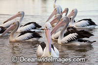 Australian Pelicans (Pelecanus conspicillatus), resting on the surface of the ocean. This large water bird is found throughout Australia and New Guinea. Also in Fiji and parts of Indonesia and New Zealand. Central New South Wales coast, Australia.